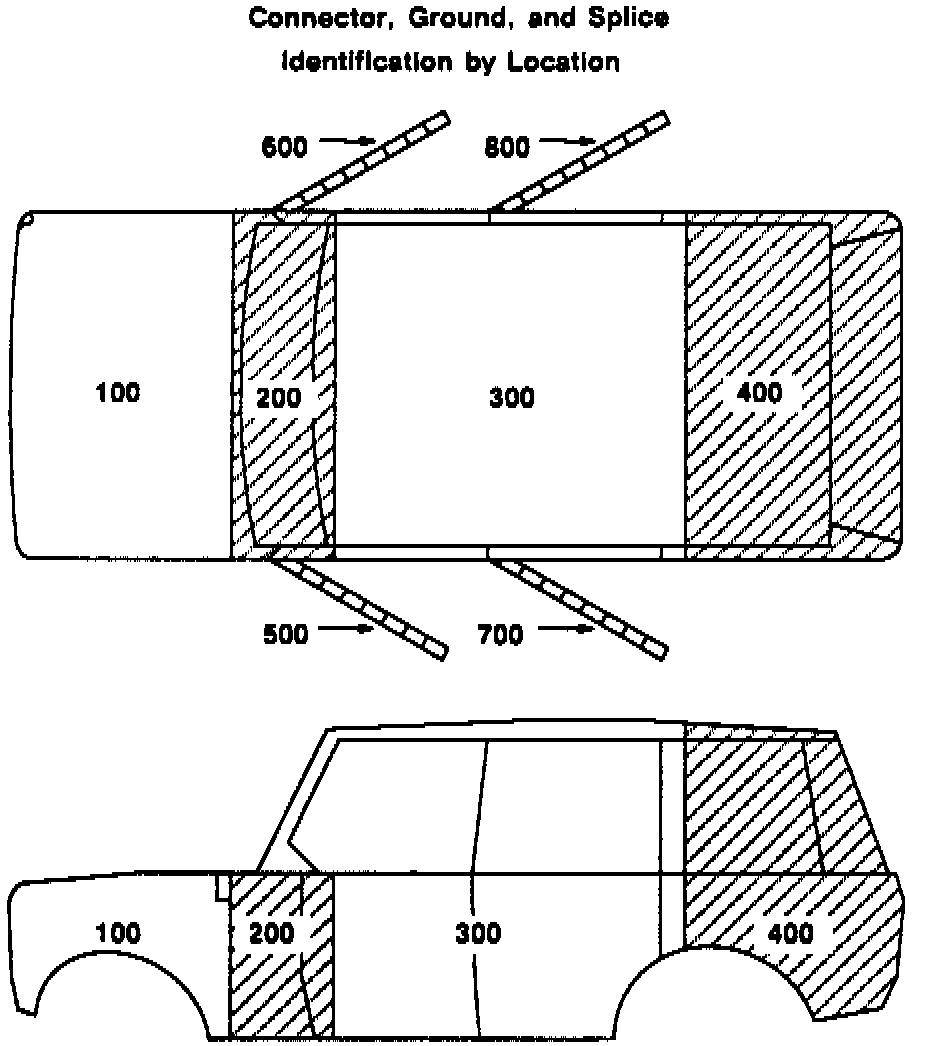 Connectors, Grounds, and Splices are identified by a letter followed by a number. Connectors are identified by C, grounds by E, and splices by S. Some splices are contained In junction connectors. These splices are identified by the prefix "HJ" below the splice's reference number. The number assigned to the connector. ground, or splice corresponds to its location in the vehicle.