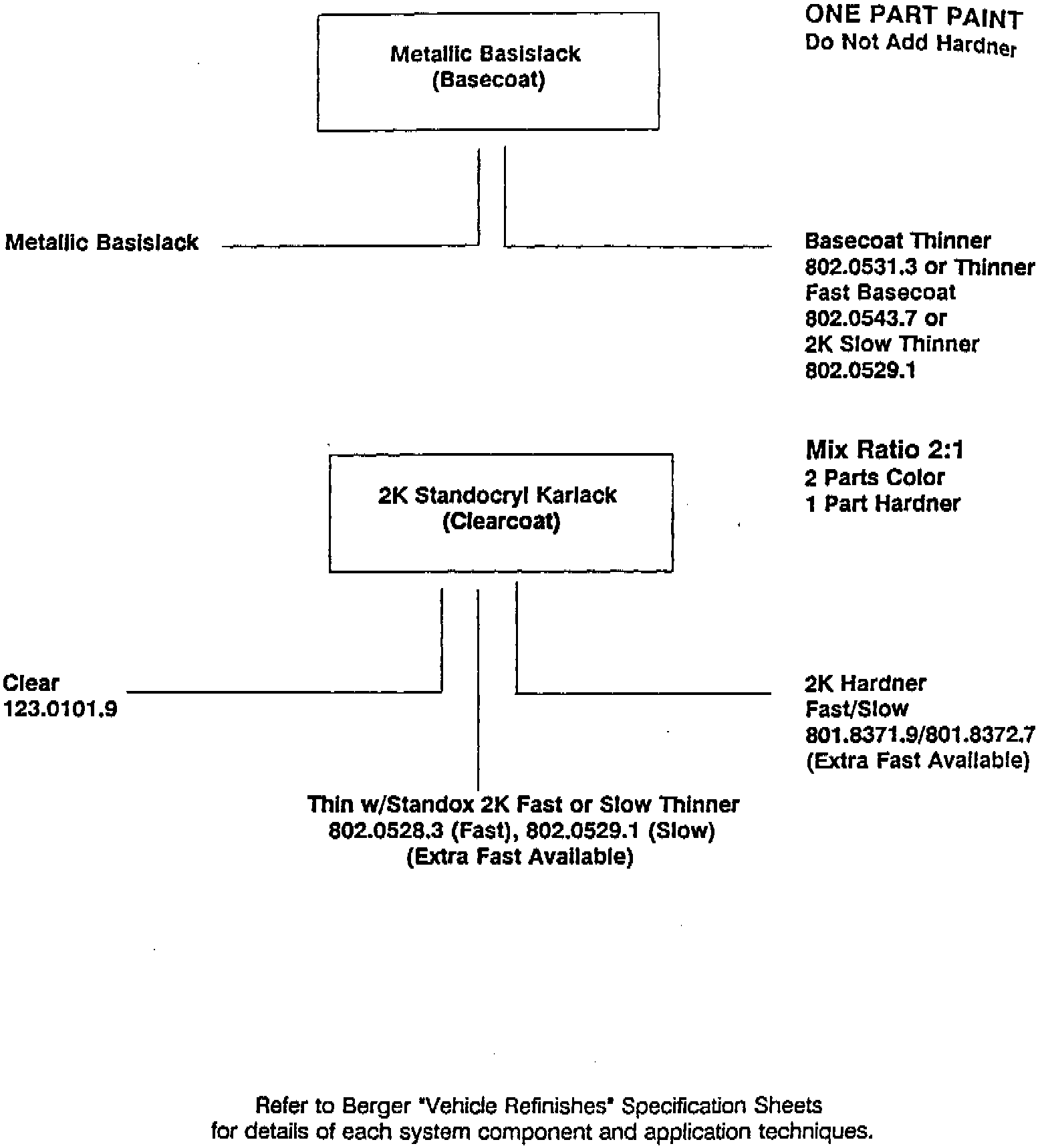 Included are the components of each paint type as well as the Berger reference numbers for each. Detailed setup and blending information for each type is found in the Berger Vehicle Refinishes specification sheets which are part of Service Bulletin 87/001 in the General Information section.