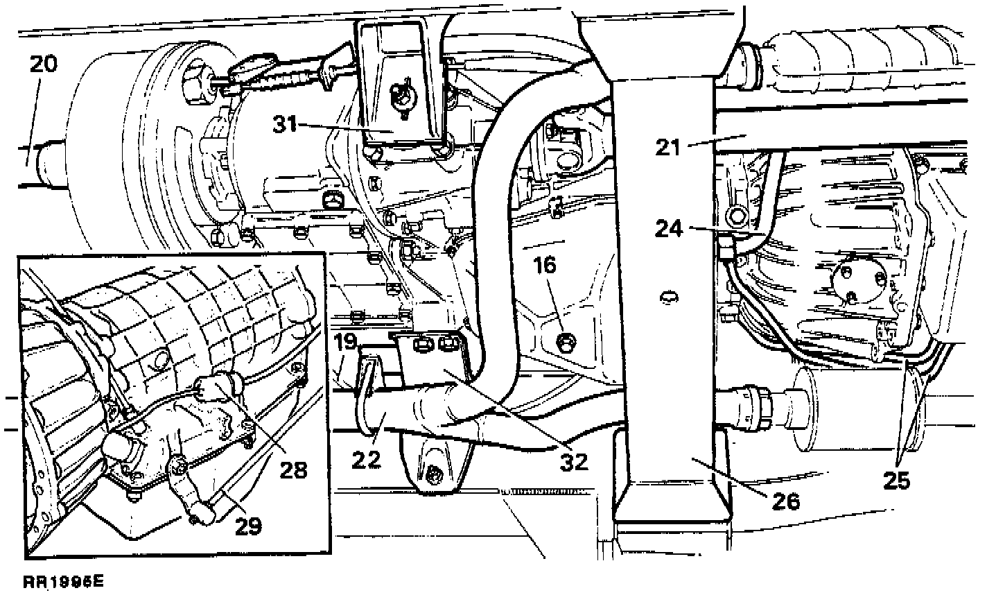 31. Remove the nuts and bolts holding rear left-hand side, mounting bracket to chassis.