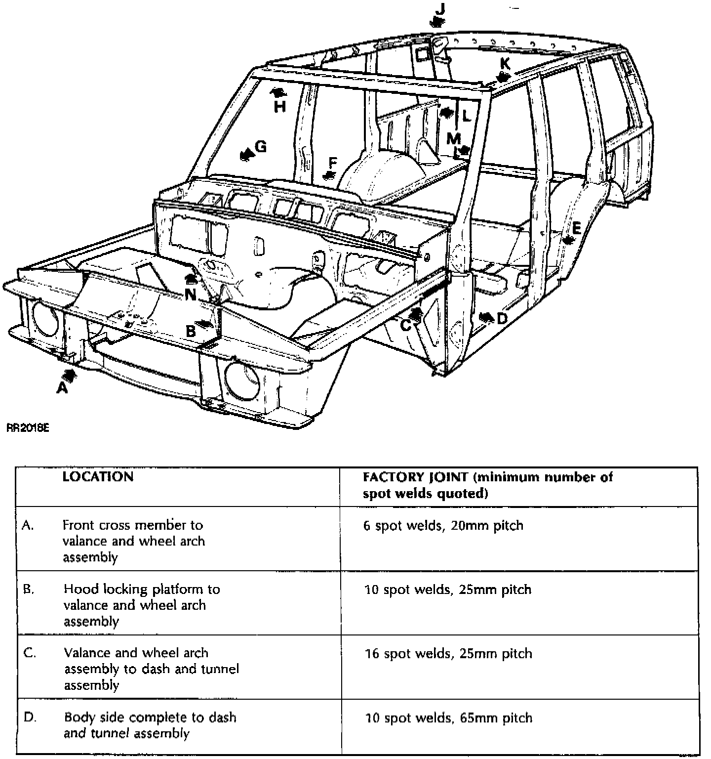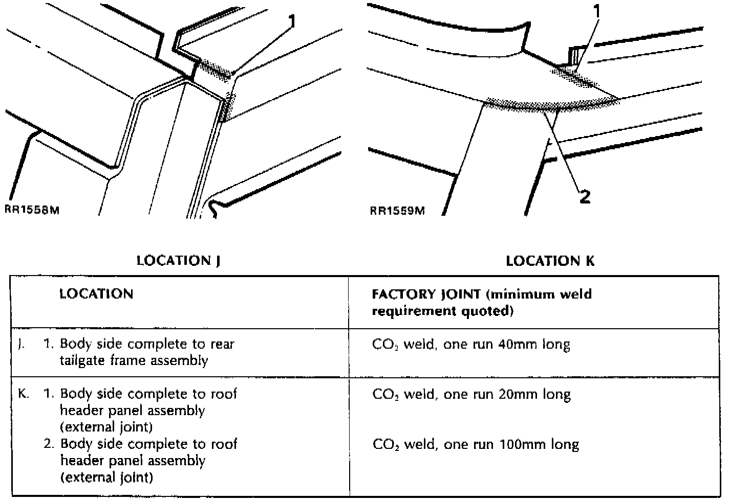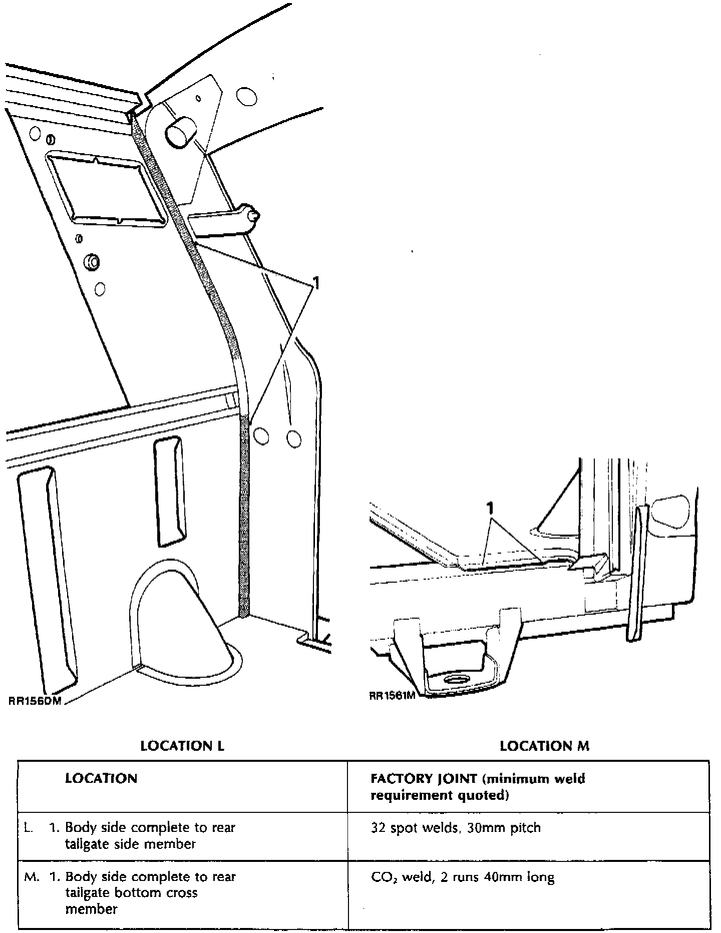 The following charts and illustrations show the locations and types of weld for securing the body side assembly, tailgate frame assembly and the front valance and wheel arch assembly. Before undertaking any spot weld joints to the inner body, it is advisable to make a test joint using offcuts of the damaged components, and to use this test piece to perform a weld integrity test.