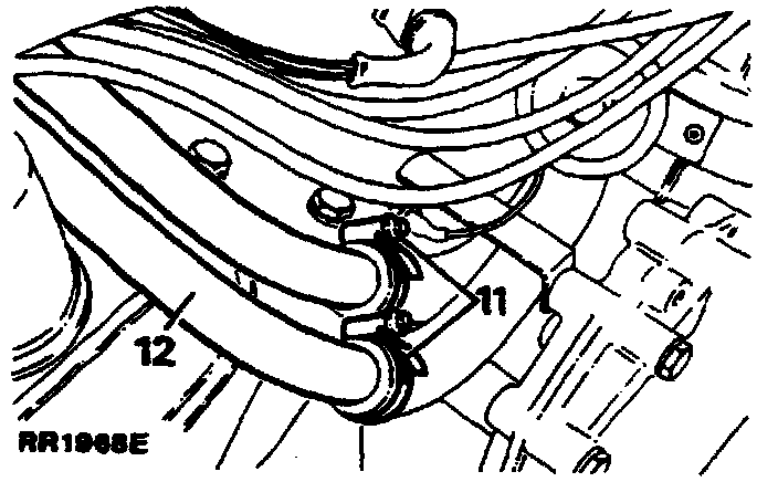 11. Release hose clamps securing 2 heater hoses to the rigid heater pipes at the front right hand rocker cover.