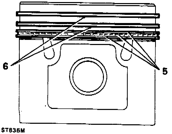 5. Position the oil control piston rings so that the ring gaps are all at one side, between the piston pin and piston thrust face. Space the gaps in the ring rails approximately 25 mm (1 in) to each side of the expander ring joint.