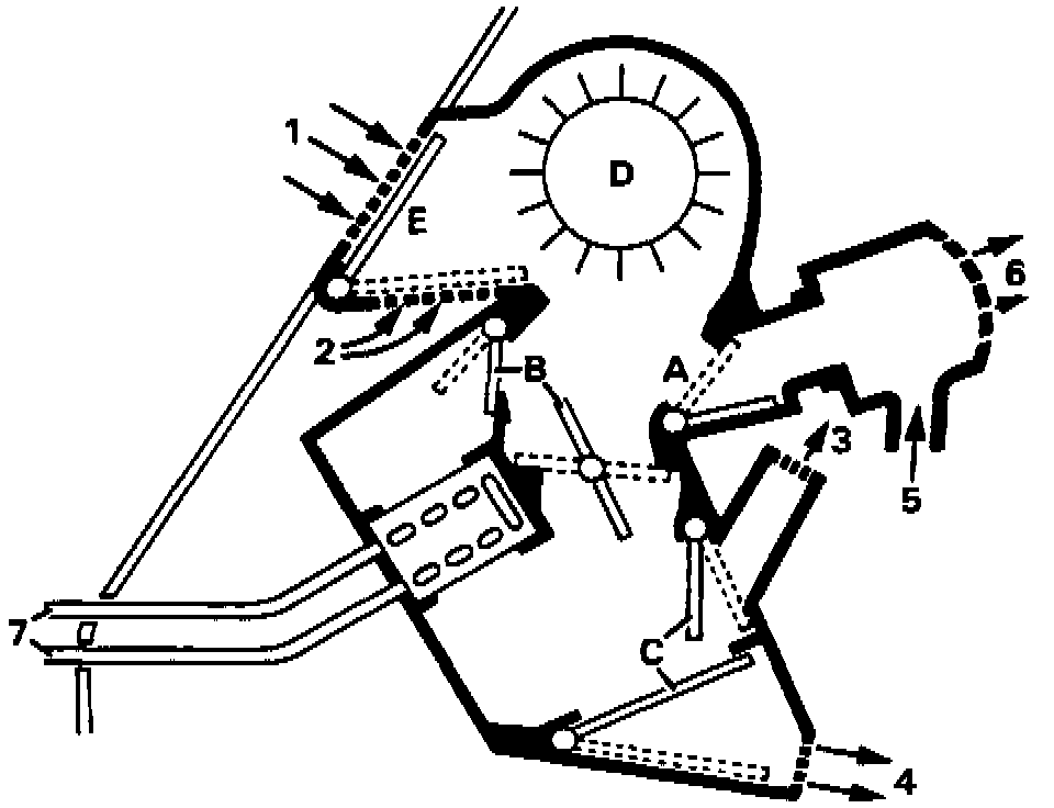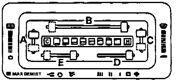 Moving the control to the left switches off the vacuum and door E which is spring loaded, opens the fresh air vent A and closes the recirculation vent 2.