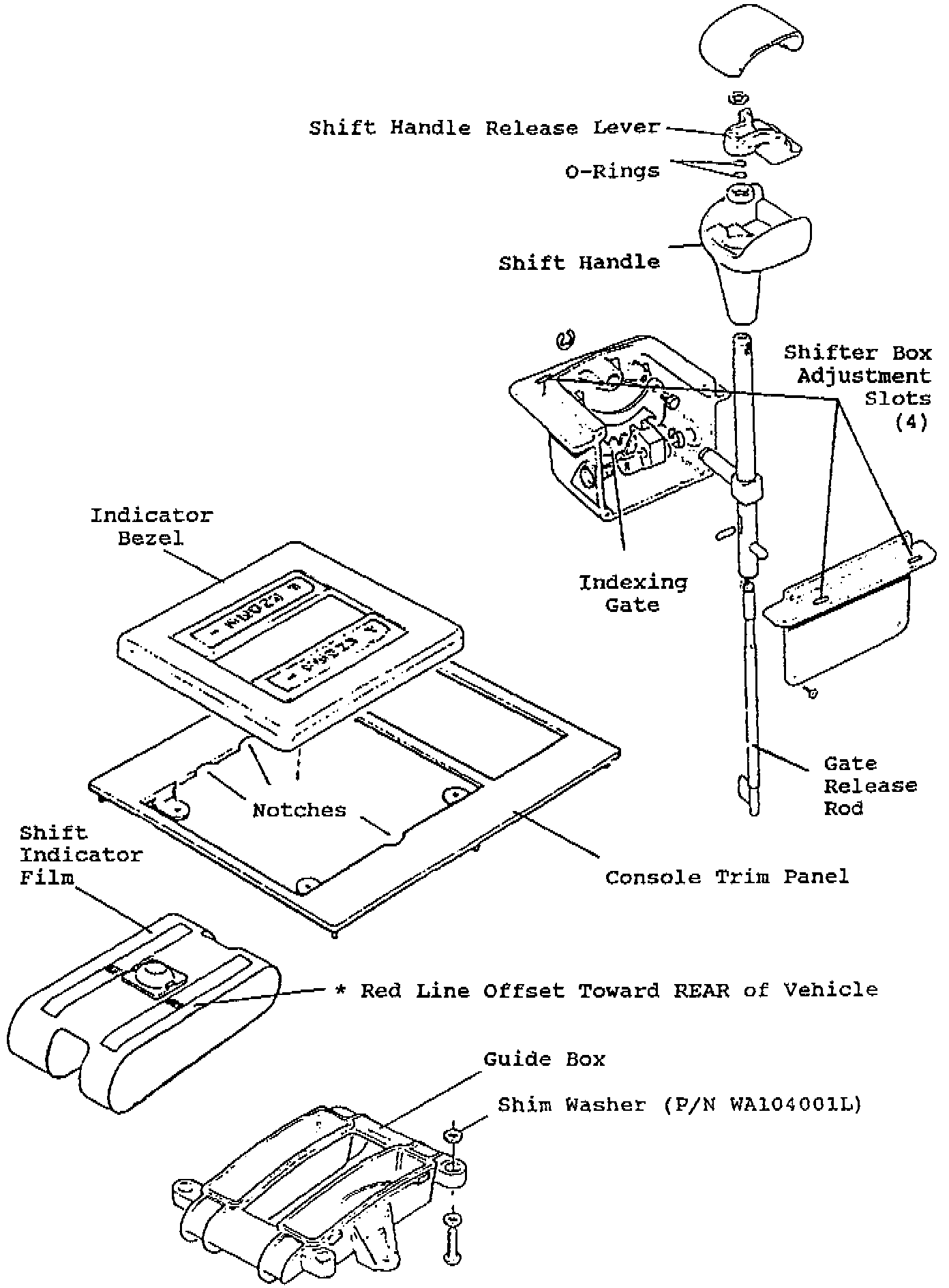 5. Check the alignment in park, Reverse, Neutral, "D", and "3". Also check that the indicator graphic pivot-ball mount does not ride underneath the indicator bezel when in park. If the alignment is satisfactory, remove the trim panel, attach the illumination bulb wiring, refit the trim panel and assemble the shift handle, ensuring that two O-rings are placed over the gate release rod prior to installing the release lever and E-clip. No further adjustment is needed.