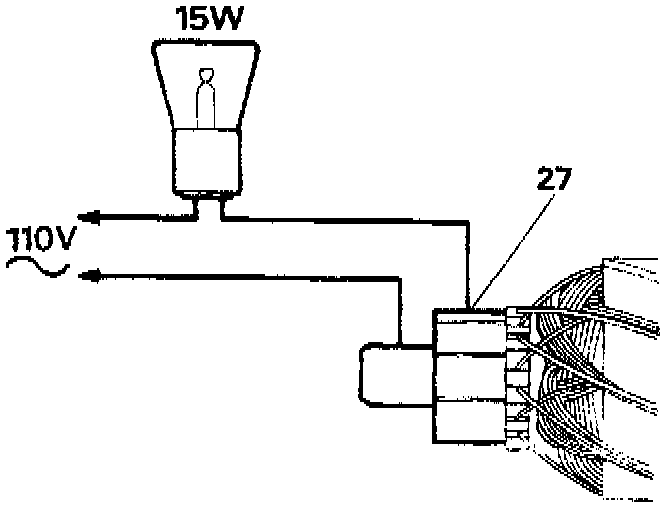 27. Check the armature insulation using suitable test equipment. Connect the tester between any one commutator segment and the shaft. The method illustrated uses a 110V, 15W test lamp. If the lamp illuminates the armature is faulty, and a replacement component is required.