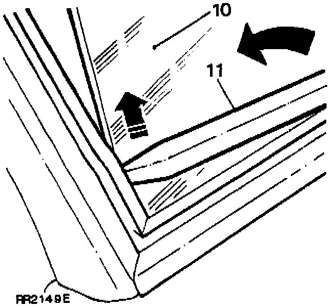 6. Work the glass into the bottom of the windscreen rubber using a soft blunt implement (11) shaped with a wedge type point, working up and around the seal and at the same time pushing the screen onto the rubber, ease the lip of the seal over the windscreen glass as illustrated.