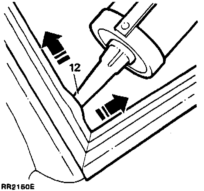 7. Apply Sikaflex 221 or 255 adhesive sealant (12) between the outer lip of the rubber moulding and exterior surface of the windscreen, ensure the sealant is applied to the bottom of the channel.