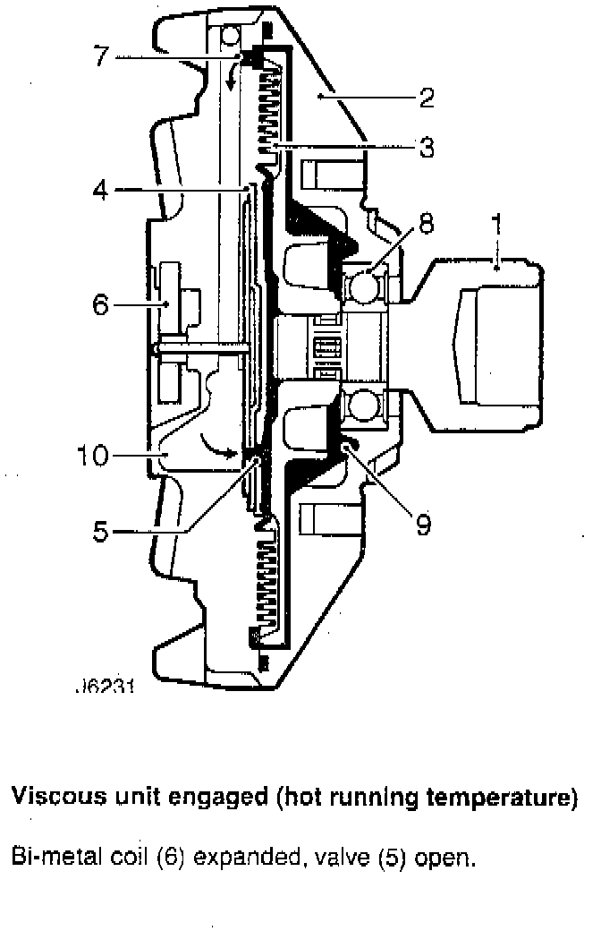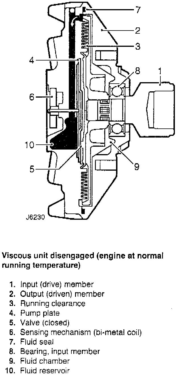 The viscous drive unit for the engine cooling fan, provides a means of controlling the speed of the fan relative to the running temperature of the engine. The viscous unit is a type of fluid coupling, which drives the fan blades by means of silicone fluid.