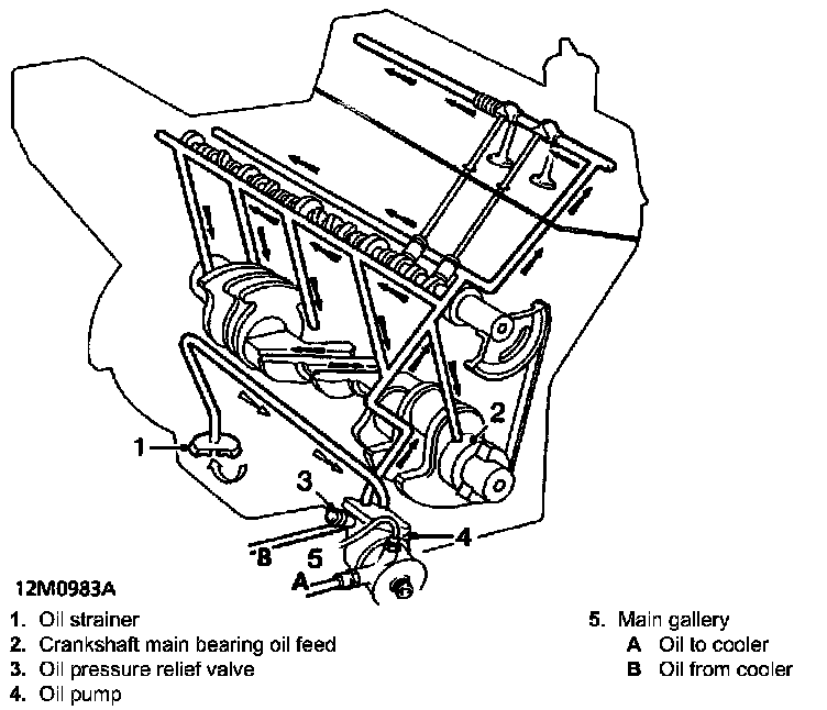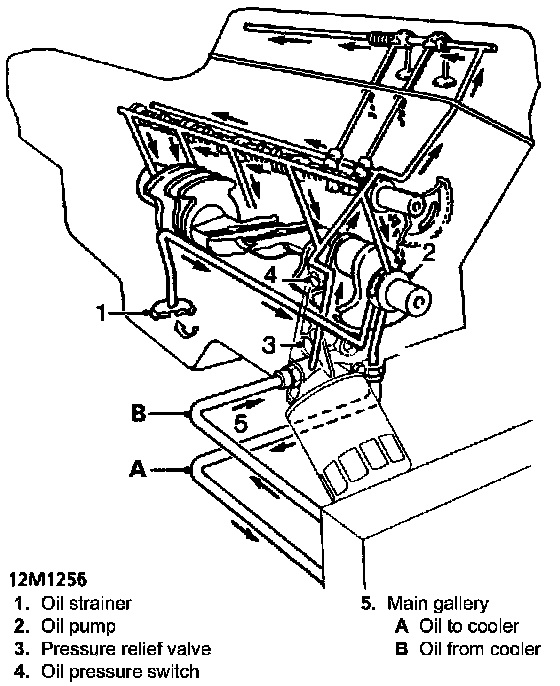 Oil is drawn from the pressed steel sump through a strainer and into the oil pump, excess pressure being relieved by the pressure relief valve. The oil pressure warning light switch is screwed into the oil pump cover and registers the oil pressure in the main oil gallery on the outflow side of the filter. Pressurized oil passes through an oil cooler - if fitted to the full flow oil filter and through internal drillings to the crankshaft where it is directed to each main bearing and to the big end bearings via Nos. 1, 3 and 5 main bearings. An internal drilling in the cylinder block directs oil to the camshaft where it passes through further internal drillings to the hydraulic tappets, camshaft journals and rocker shaft. Lubrication to the thrust side of the cylinders is by oil grooves machined in each connecting rod big end joint face, which are timed to align with holes in the big end journals on the power and exhaust strokes.