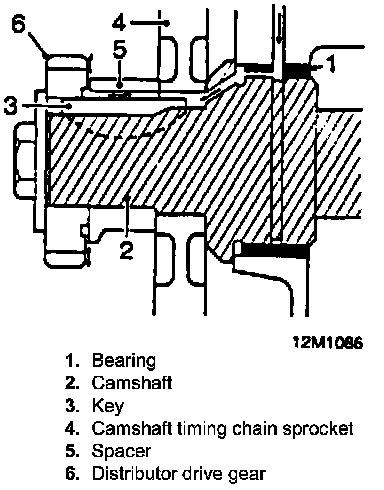 The distributor drive and timing chain are lubricated from the camshaft front bearing. The feed to the timing chain is channelled along the camshaft sprocket, key and spacer.
