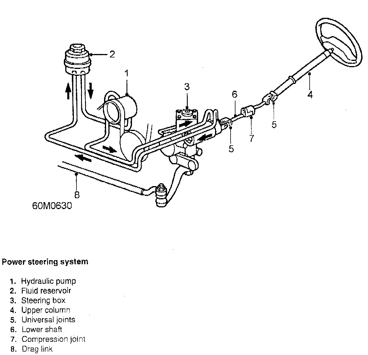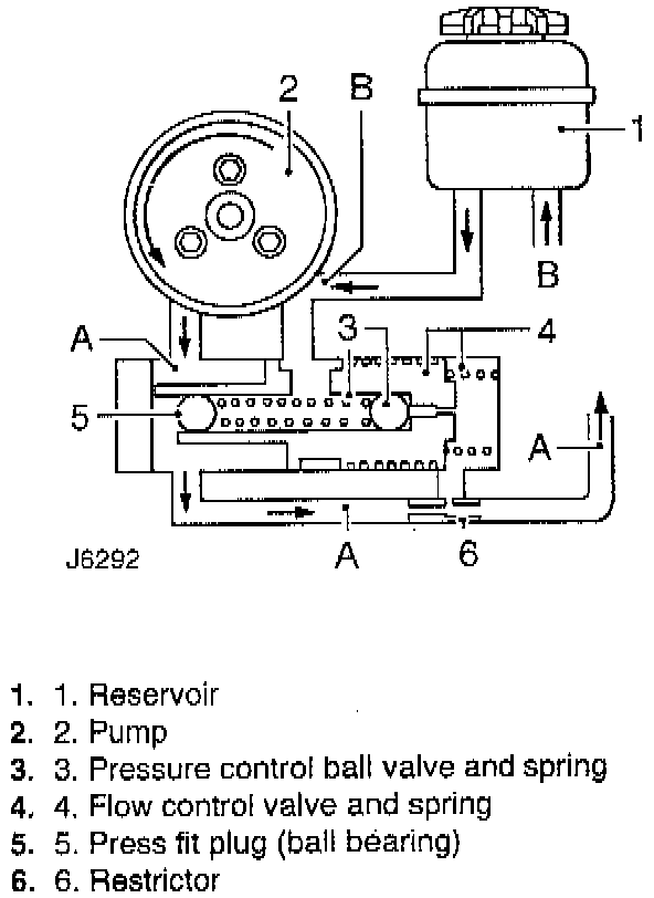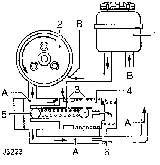 With no demand for assistance the rotary valve in the steering box acts as a pressure relief valve, allowing fluid -A- to flow freely through the steering box and back to the reservoir and pump inlet -B-.
