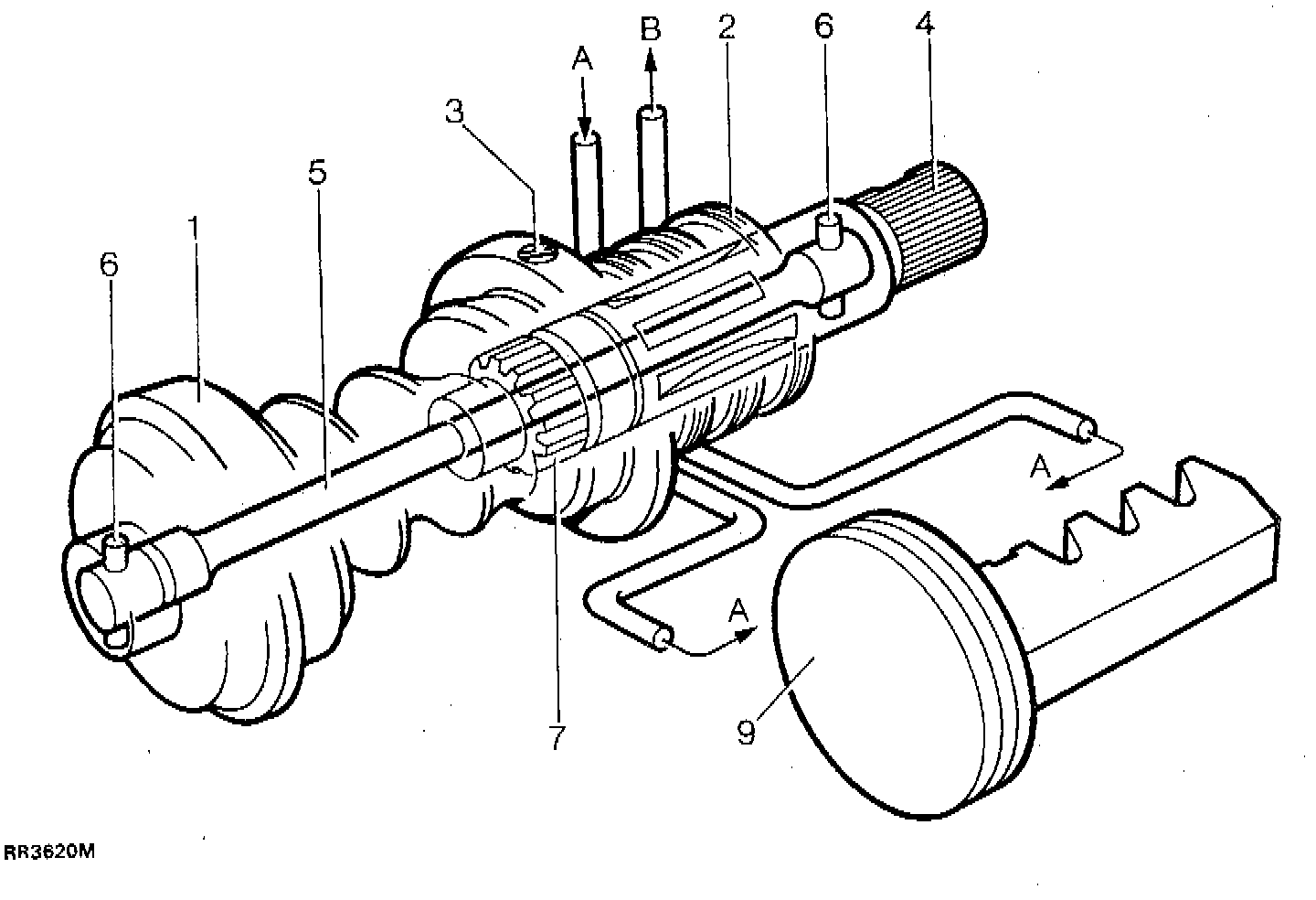 When there is no demand for assistance, the torsion bar holds the input shaft and sleeve valve ports in neutral relationship to one another, allowing equal pump pressure -A- to both sides of the piston/rack (9). Any excess fluid flow from the pump returns to the reservoir via -B-.
