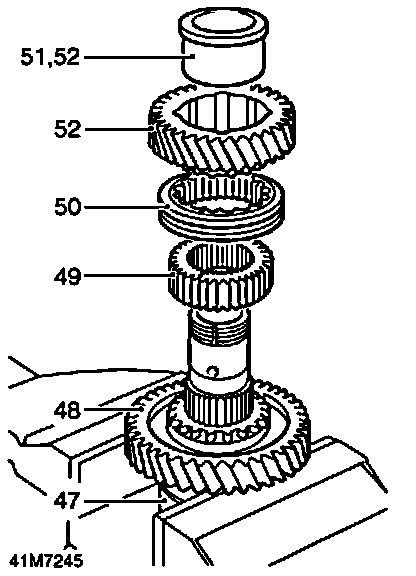 48. Fit low range gear ensuring that dog teeth on gear are towards threaded end of shaft.