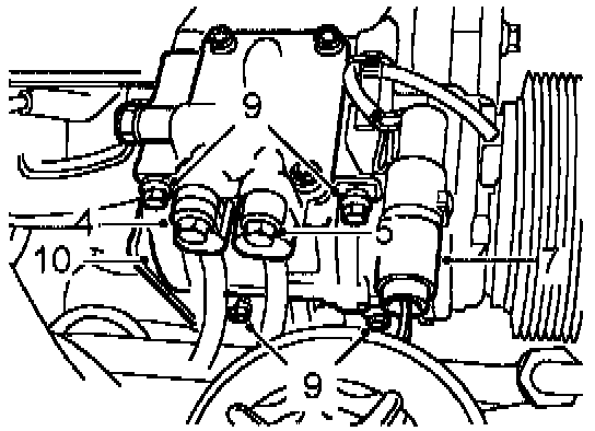9. Remove 4 bolts securing compressor to mounting bracket.