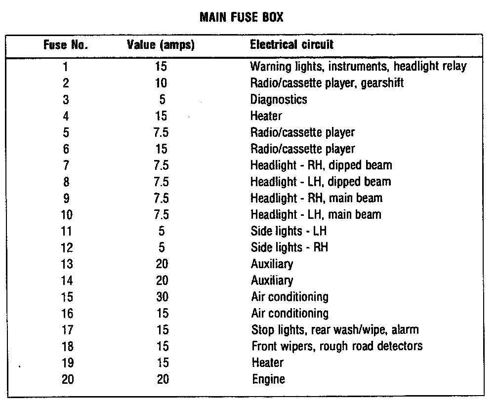 The main fusebox is located behind an access panel in front of the transfer box gear lever. Pull the panel away from the console to gain access to the fuses. The fuse ratings and the circuits they protect are in the following chart.