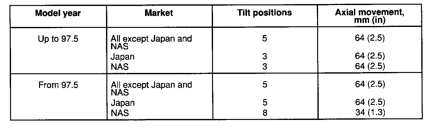 The steering system incorporates a safety steering column, designed to collapse on impact. The tilt and axial position of the column are adjustable, operated by a single column mounted control. The range of tilt and axial adjustment available depends on Model Year and market.