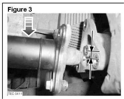 2. Lightly push or pull the propeller shaft to rotate the differential as required to achieve equal distance above and below the centering flange spigot and the locating bush (see Figures 3 & 4).