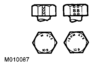 In addition to marks identifying the manufacturer, the top of the bolt head is also marked with symbols indicating the strength grade, e.g. 8.8; 10.9; 12.9; 14.9. As an alternative, some bolts and screws have the M and strength grade symbol stamped on the flats of the hexagon.