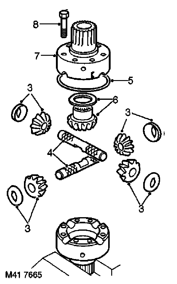4. Fit cross shafts, planet gears and dished thrust washers in rear half of carrier.Ensure that cross shafts are fitted correctly. Do not fit the sun gear into the rear half carrier at this stage.