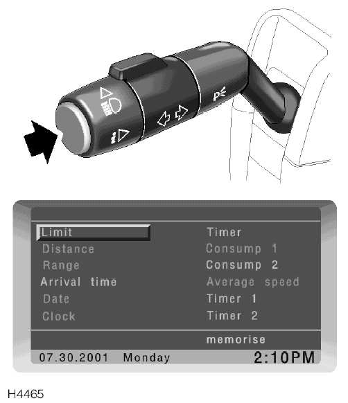 To call up the selected functions on the instrument pack message centre, press in the button on the direction indicator lever briefly. Repeated presses will display other selected functions.