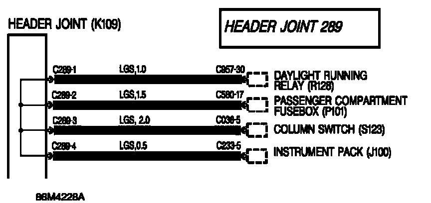 Header joints are identified by their corresponding connector number with a numbered suffix to indicate the pin-out detail of the wire, i.e. C289-1 identifies connector 289, pin number 1. Wire insulation colour is identified in the normal way. Where wires have a predominant colour with a secondary colour stripe. the main COlour is identified first, i.e. LGS - Light Green with a Slate stripe.