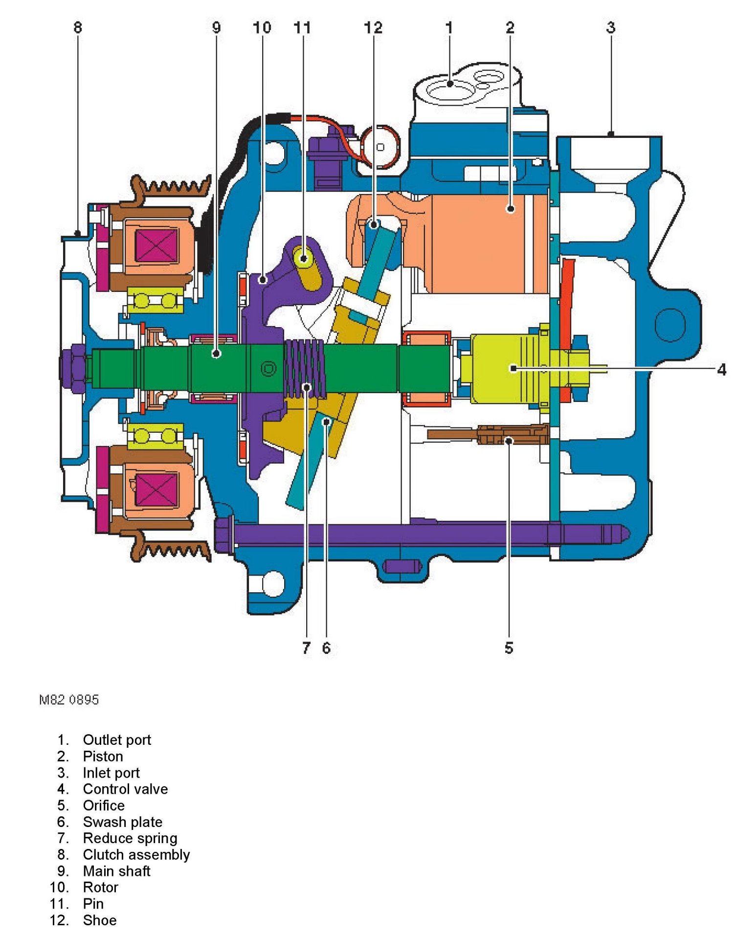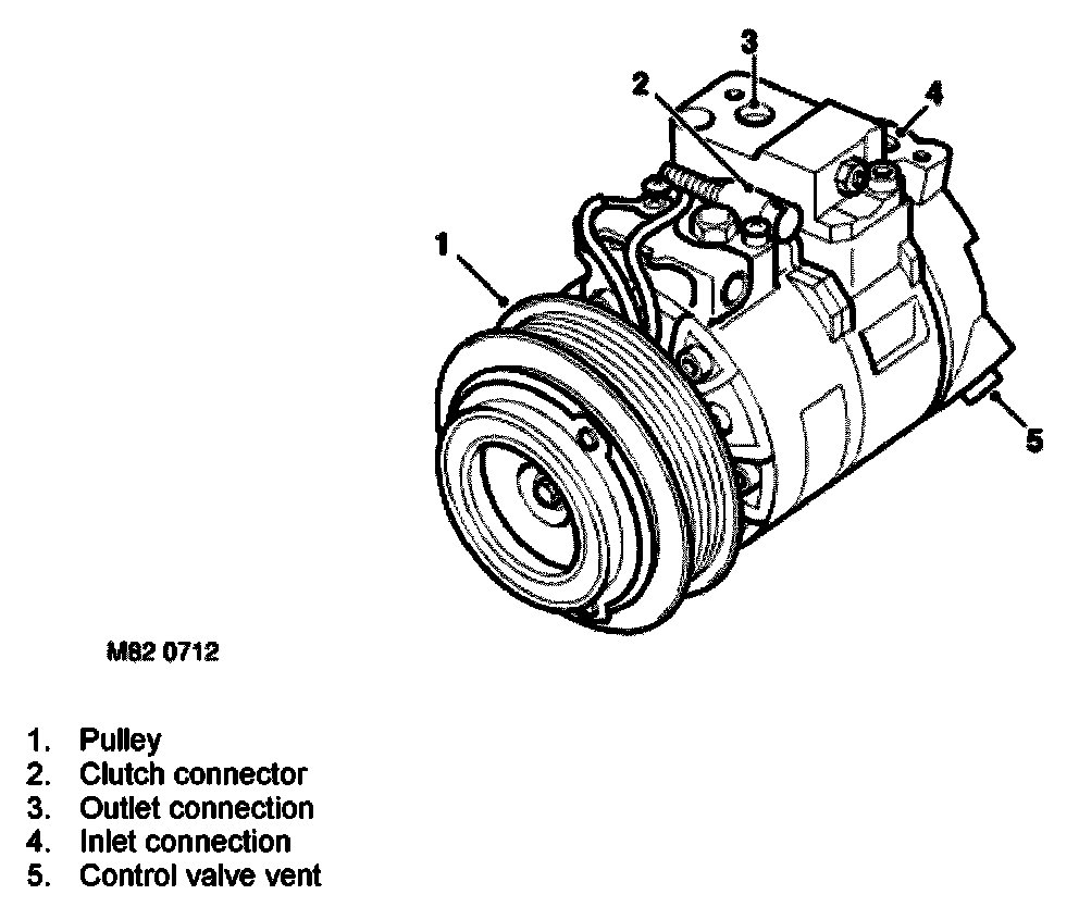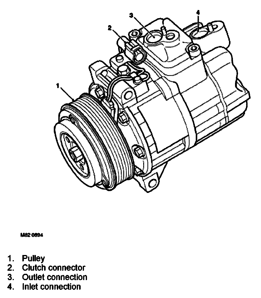 The compressor is attached to a mounting bracket on the engine, and is a seven cylinder swash plate unit with variable displacement. Up to 2004 model year, a Denso compressor is installed. From 2004 model year, a Sanden compressor is installed.