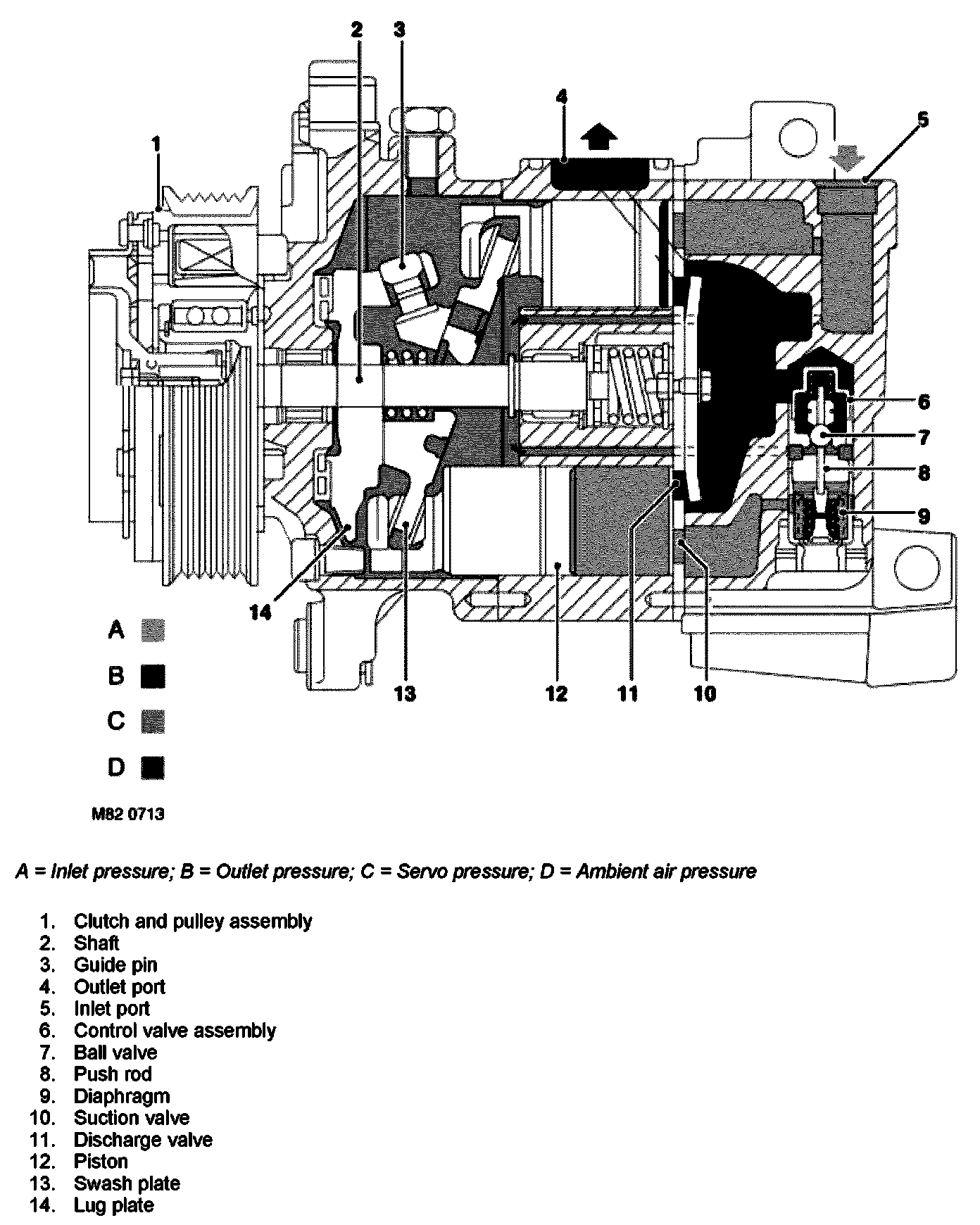 The compressor consists of a housing which contains a shaft mounted in radial and thrust bearings. A lug plate is pressed onto the shaft and the clutch and pulley assembly is splined to the end of the shaft at the front of the housing.