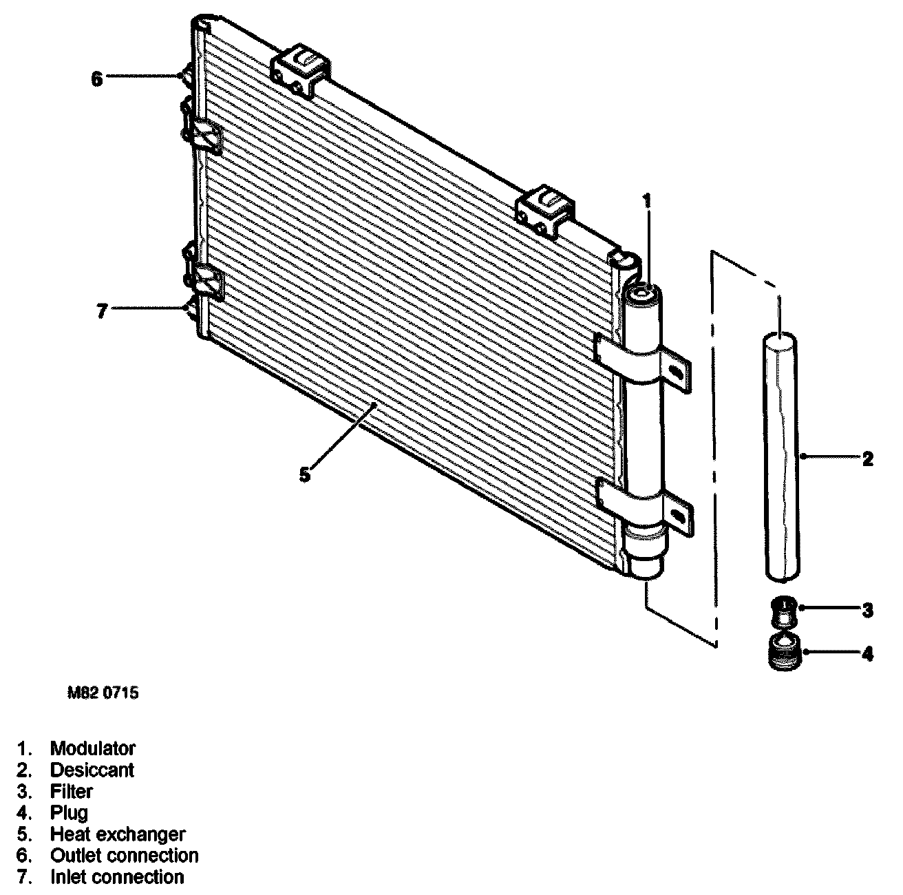 The unit is classified as a sub-cooling condenser and consists of a fin and tube heat exchanger installed between two end tanks. Divisions in the end tanks separate the heat exchanger into a three pass upper (condenser) section and a single pass lower (sub-cooler) section, which are interconnected by the modulator on the LH end of the tank. The modulator is separately serviceable unit from the condenser, and it contains a serviceable desiccant pack and filter retained by a threaded plug.