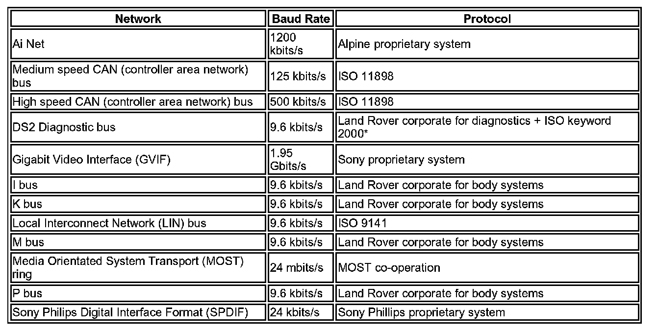 A number of different types of communication network are incorporated into the vehicle wiring harnesses for the transmission of commands and information between control modules.The configuration installed on a particular vehicle depends on the model and equipment level.