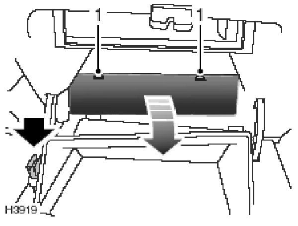 The passenger compartment fuse box is fitted behind the glovebox; to access the fuses, open the glovebox, then press down on the catches (1) whilst pulling the cover rearwards. The solid arrow in the illustration indicates the location of the fuse removal tool.