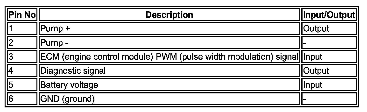 The ECM (engine control module) sends a PWM (pulse width modulation) signal to the FPDM (fuel pump driver module) from pin 20 of connector C0635 of the ECM (engine control module), the duty cycle of the signal determines the duty cycle of the pump. The ECM (engine control module) sets a target fuel pressure based on engine load. The target fuel pressure is maintained by using feedback from the fuel rail pressure sensor which is used to control the fuel pump via a closed loop PWM (pulse width modulation) signal. The PWM (pulse width modulation) signal to the pump represents half the ON time of the pump. If the ECM (engine control module) transmits a 50% on time the fuel pump control module drives the pump at 100%. If the ECM (engine control module) transmits a 5% ON time the fuel pump control module drives the pump at 10%. The fuel pump control module will only turn the fuel pump ON if it receives a valid signal between 4% and 50%. When the ECM (engine control module) requires the fuel pump to be turned OFF the ECM (engine control module) transmits a duty cycle signal of 75%.