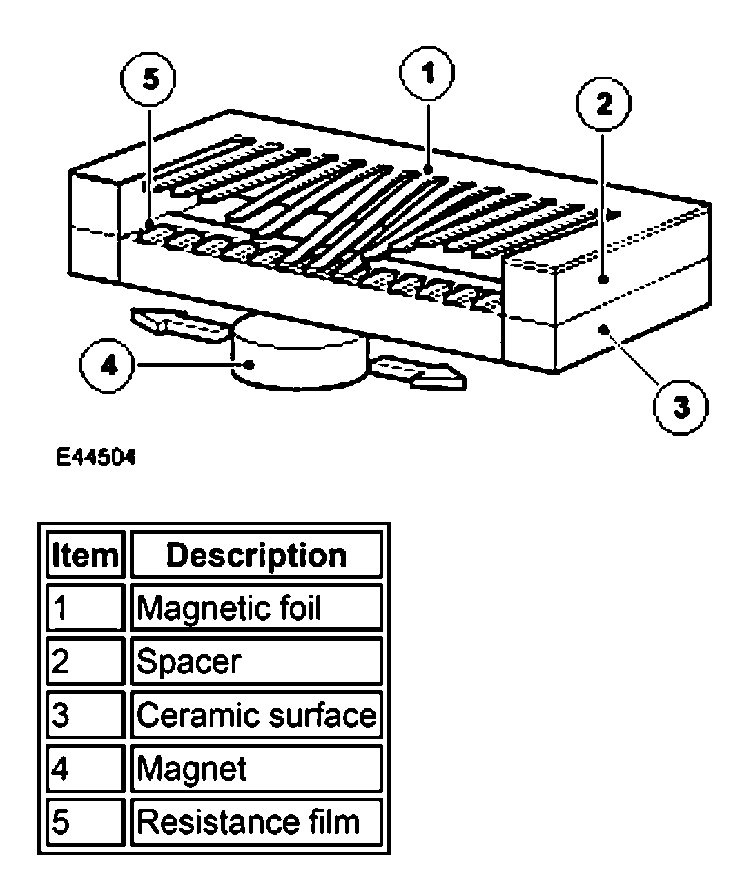 The film resistors are arranged in a linear arc with resistance ranging from 51.2 to 992.11 Ohms. The electrical output signal is output proportional to the amount of fuel in each side of the tank and the position of the float arms. The measured resistance is processed by the instrument cluster to implement an anti-slosh function. This monitors the signal and updates the fuel gage pointer position at regular intervals, preventing constant pointer movement caused by fuel movement in the tank due to cornering or braking.