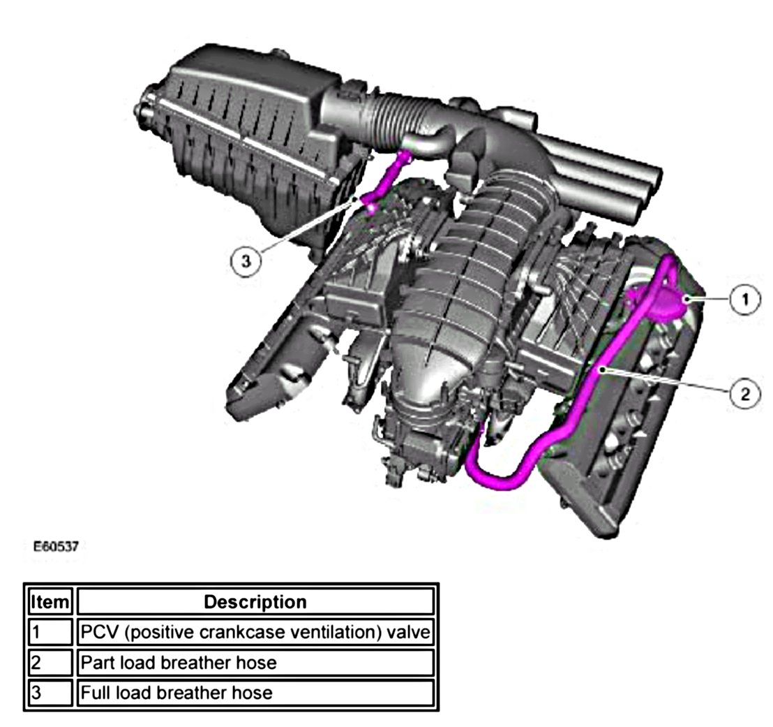 The part load breather is a flexible composite hose connected between the PCV (positive crankcase ventilation) valve and the induction elbow at the rear of the engine. The PCV (positive crankcase ventilation) valve prevents reverse flow into the crankcase.