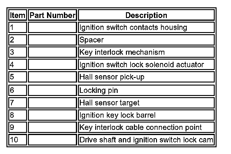 Ignition Switch and Locking MechanismThe ignition switch assembly also has a locking mechanism which works in conjunction with the immobilization control module and the steering lock control module. The ignition switch mechanism comprises an ignition switch lock solenoid actuator which prevents the ignition switch being rotated unless the key has been recognized by the immobilization control module. A Hall sensor is located in the ignition switch body and senses the rotation of the ignition switch. This signal is transmitted on the K bus and is used by the steering lock control module to confirm the key status with the immobilization control module. Refer to Operation later for the functional description.