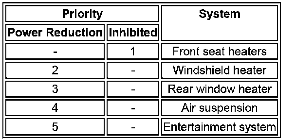 If the electrical load is more than the maximum load available, the ATC (automatic temperature control) module requests an increase of engine idle speed using the medium speed CAN (controller area network) bus message to the ECM (engine control module). If an electrical load imbalance remains after an increase in engine idle speed, or if the electrical load is more than the capacity of the charging system, the ATC (automatic temperature control) module reduces the electrical load by reducing the power of some vehicle systems or inhibiting their operation. The number of systems controlled depends on the electrical load reduction required. The systems controlled, and the order in which their power is reduced or they are inhibited, are contained in three priority tables. The table used depends on the ambient air temperature, battery temperature and ECT (engine coolant temperature) :