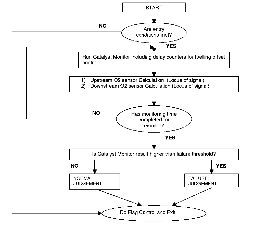 After the monitor has run for a sufficient period of time, the results are calculated. These are determined by accumulating the locus of the downstream exhaust gas oxygen sensor signal against the accumulation of the upstream exhaust gas oxygen sensor. I.e. the more active the downstream sensor, the less oxygen storage capacity the catalyst has, resulting in a correspondingly higher locus value. With a correctly operating catalyst, the downstream sensor is not so active, so lower locus values are obtained than would be recorded with a faulty system.