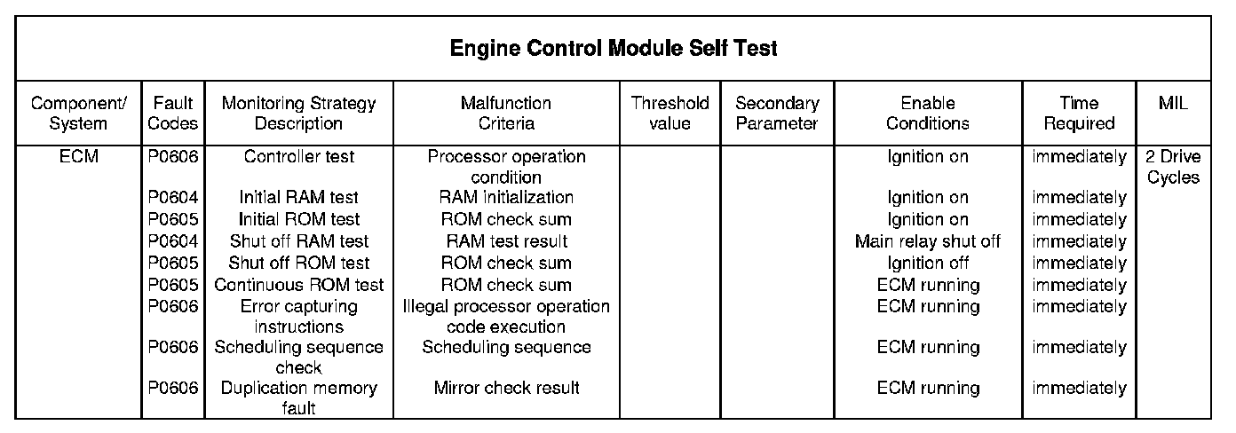 The ECM performs a number of self checks on both the its Random Access Memory (RAM), Read only Memory (RAM) and the two central processor units it uses to control the engine management system. A failure of any of the self-checks will require the ECM to be replaced.