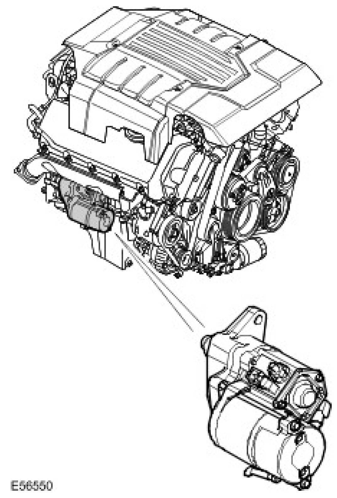 The starter motor is located on the rear RH side of the engine block. The motor is secured to the block and protrudes through an aperture to drive the flywheel via a ring gear.