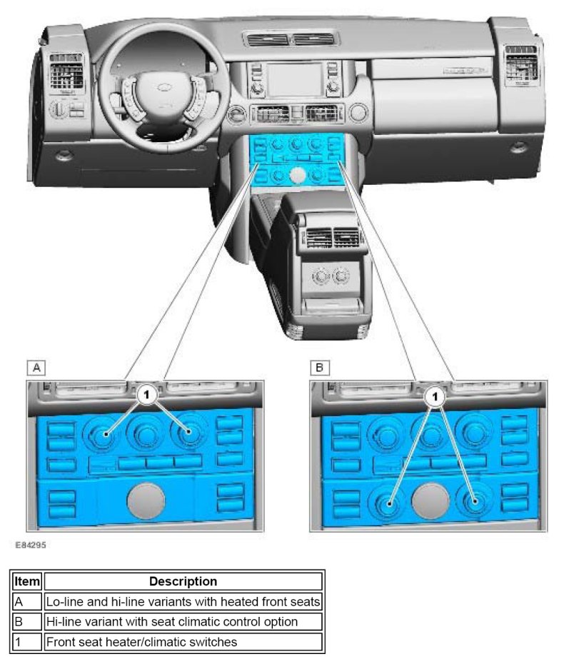 High specification vehicles are fitted with climatic seats, which are able to deliver heating and cooling to the front seat occupants. Vehicles fitted with climatic seats feature 2 additional rotary controllers mounted in the instrument panel switch pack, adjacent to the clock. The rotary controllers are used to select cooling. Three levels of cooling and heating are available, dependant on the degree of switch rotation. The center of the switch is pressed once to ventilate both the seat back and cushion (both indicators on the switch will illuminate). A second press of the switch will ventilate the seat back rest only (the cushion indicator will extinguish).