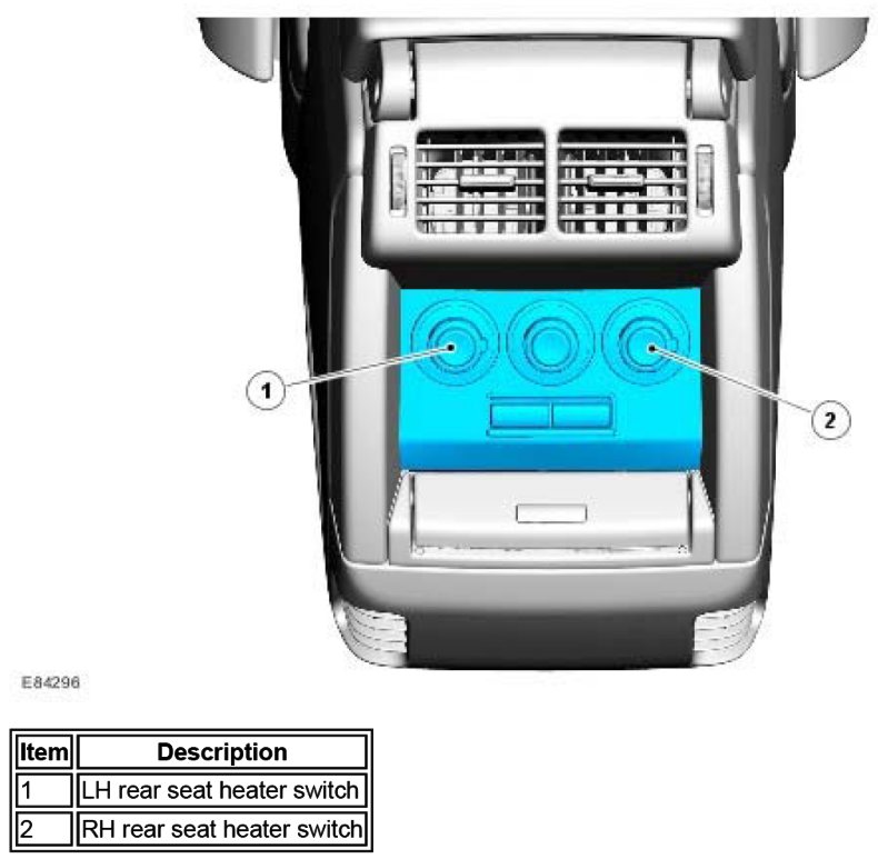 Operation of the heated seats is controlled by the ATC module. Two push-button switches are mounted at the rear of the floor console. Each switch has 2 integral Light Emitting Diodes (LED) to display the level of heating selected.