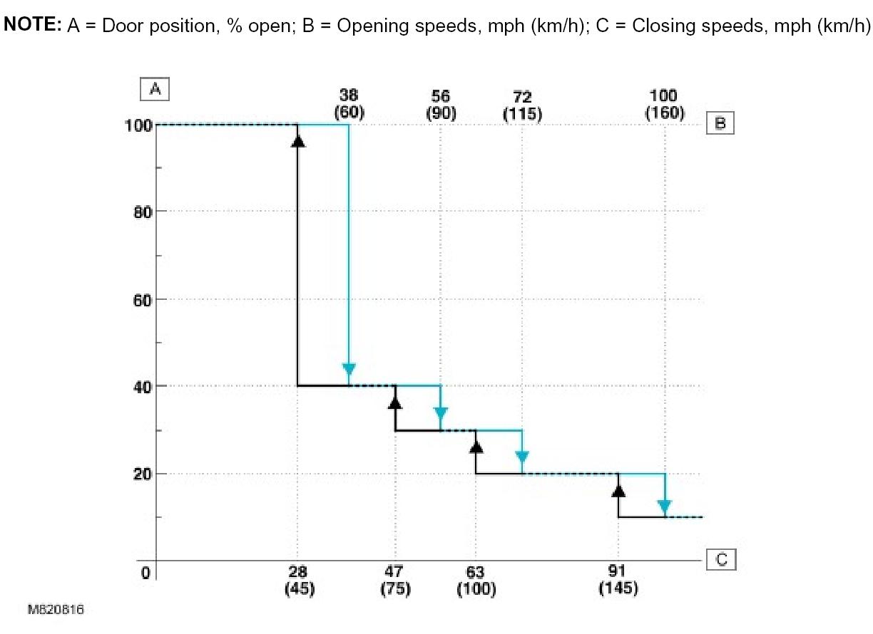 The ATC (automatic temperature control) module progressively closes the ram air doors, in four steps, as vehicle speed increases, and opens them again as vehicle speed decreases.At the maximum closed position, 90-of the fresh air inlet area is closed off.A hysteresis of 15 km/h (9 mph) prevents the ram air doors from hunting at a constant vehicle speed.