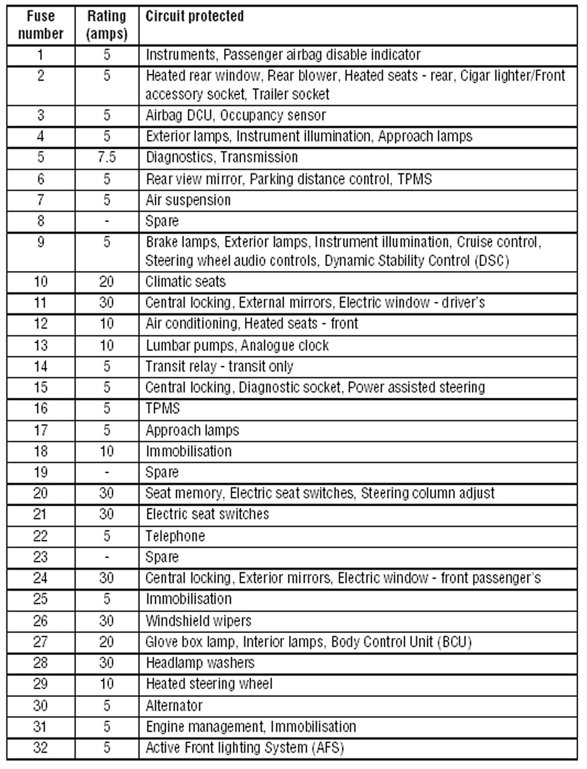 Fuses 1 - 32 Specifications: