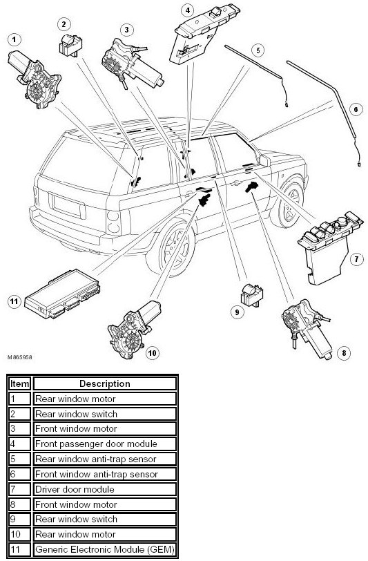 Electric windows are installed in all four doors. The front windows are controlled by their respective door modules integrated into the window switch packs. The rear windows are controlled by the Generic Electronic Module (GEM). The GEM and the door modules communicate with each other on the P bus.