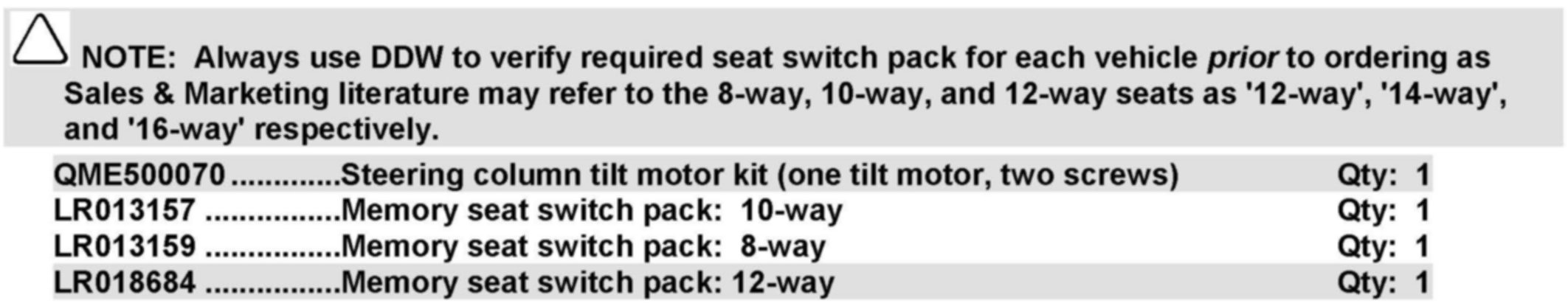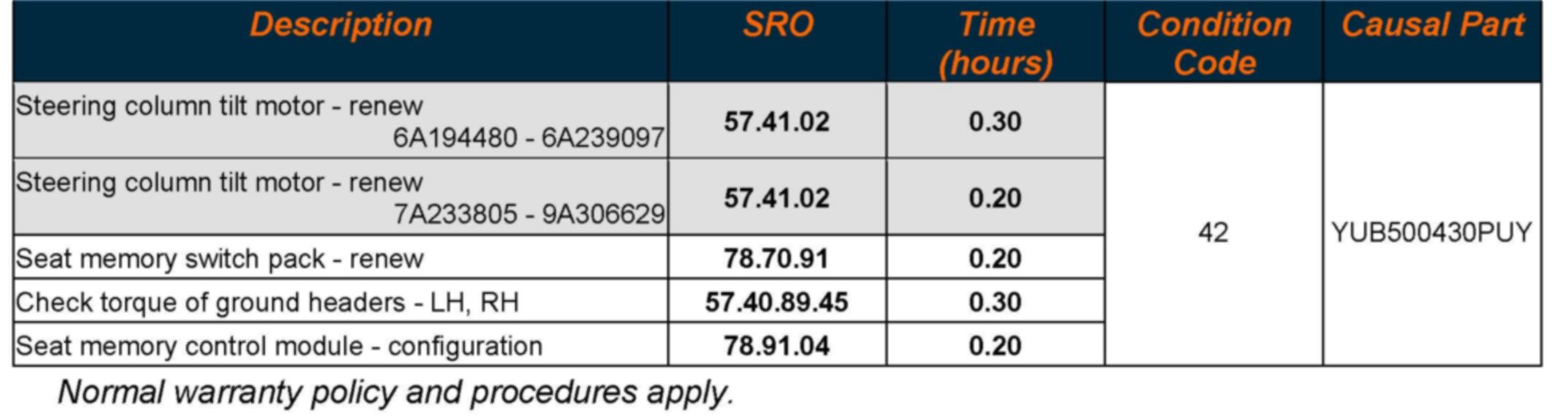 These faults may be caused by corruption of the Memory Seat Module software or steering column tilt motor wear.