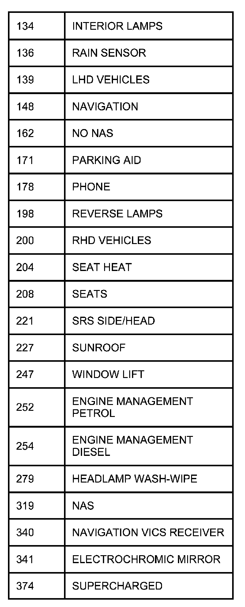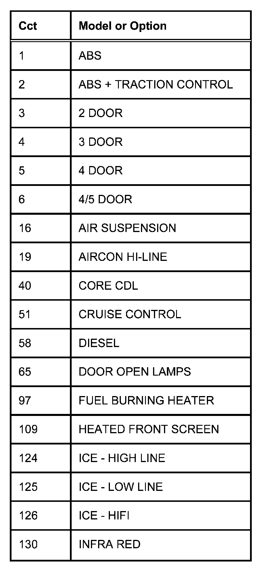 The following table contains a list of circuit (Cct) reference numbers against a description of the applicable model or option. This information should be used in conjunction with the connector pin-out tables to determine the wire configuration of the vehicle under test.