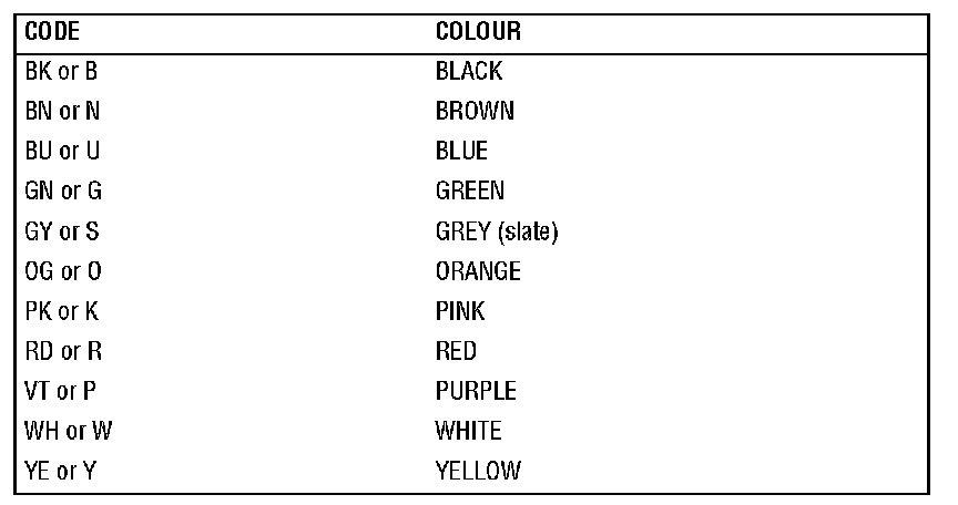 Connectors and header joints are identified by their corresponding connector number with a numbered suffix to indicate the pin-out detail of the wire, i.e. C0292-1 identifies connector 292, pin number 1. Wire insulation colours are listed in a table at the end of this section. Where wires have a predominant colour with a secondary colour tracer, the main colour is identified first, i.e. WH-BK - white with a black tracer.