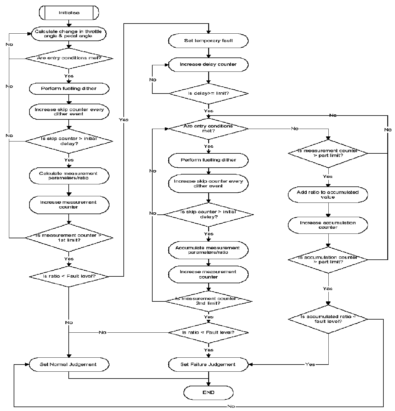 When the normal or continuous flags are made active, and the entry conditions are still met, then a failure counter is incremented or decremented by a calibratable amount. The intermittent flag is checked every 30 seconds, and operates as above for the continuous flag. Once these failure counters have reached a threshold then failure or normal judgements are made. A general flowchart of the operation of the monitor is shown below.