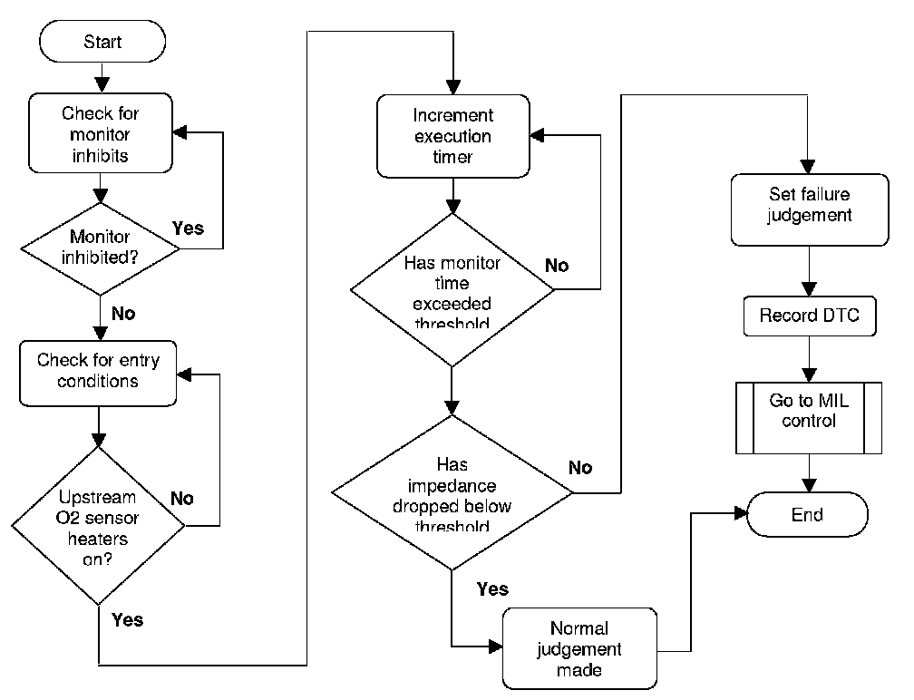 After the engine has started, the upstream oxygen sensor heaters are activated after a delay time. The monitor checks the change in impedance of the upstream oxygen sensors due to the heating. If the impedance level has not dropped by a defined level in a defined amount of time, then a failure will be detected.