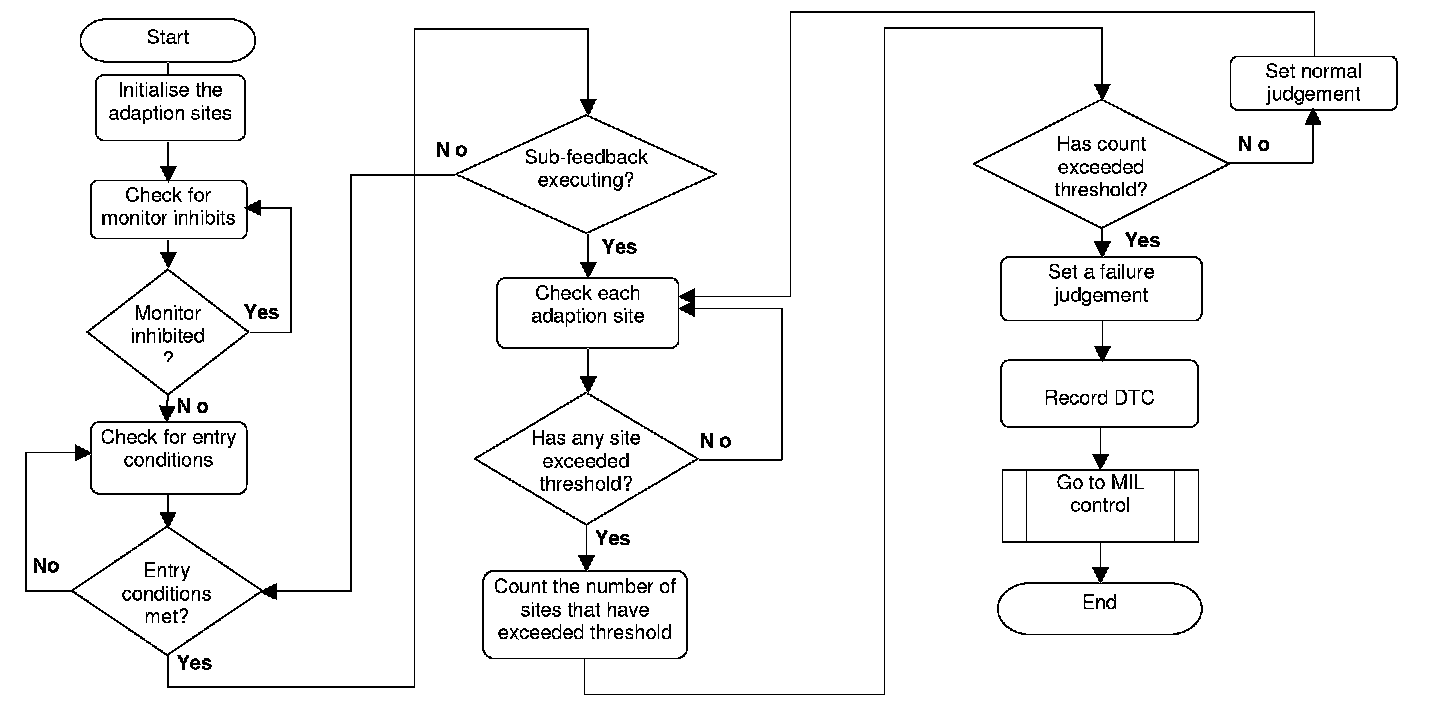 The diagnostic runs if the entry conditions have been met, all the oxygen sensors are working, the fuel system adaptions are within their limits and sub-feedback is operating. The monitor looks at the different sites of the Sub-feedback monitor and checks how many sites are over the fault threshold. If a pre-determined number of sites have exceeded this threshold, then a fault will be detected.