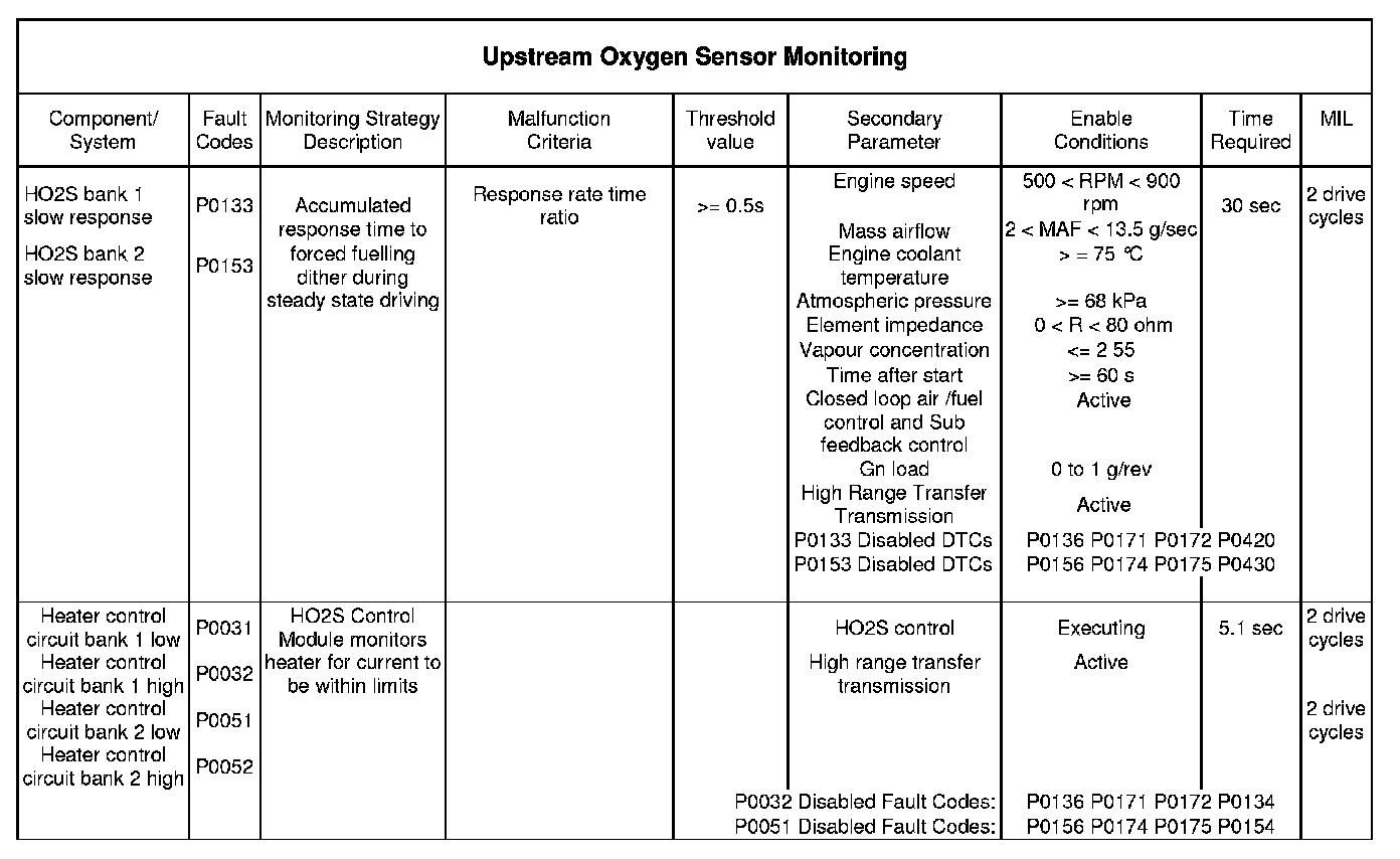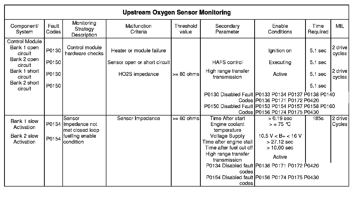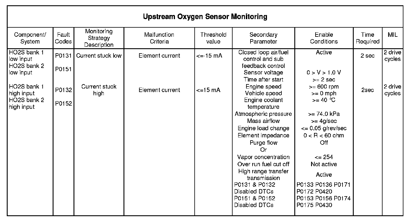 This monitor is designed to detect continuous and intermittent faults with the upstream oxygen sensor signals. The monitor will operate continuously provided the entry conditions are met and the monitor is not inhibited for any of the reasons listed in the table.